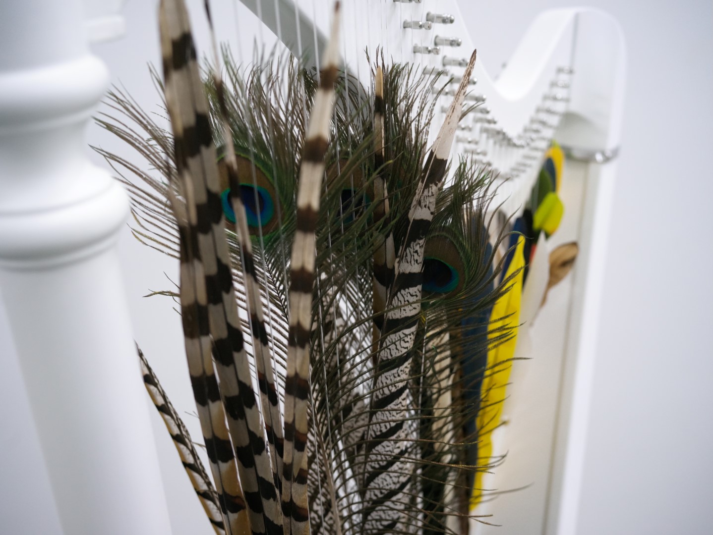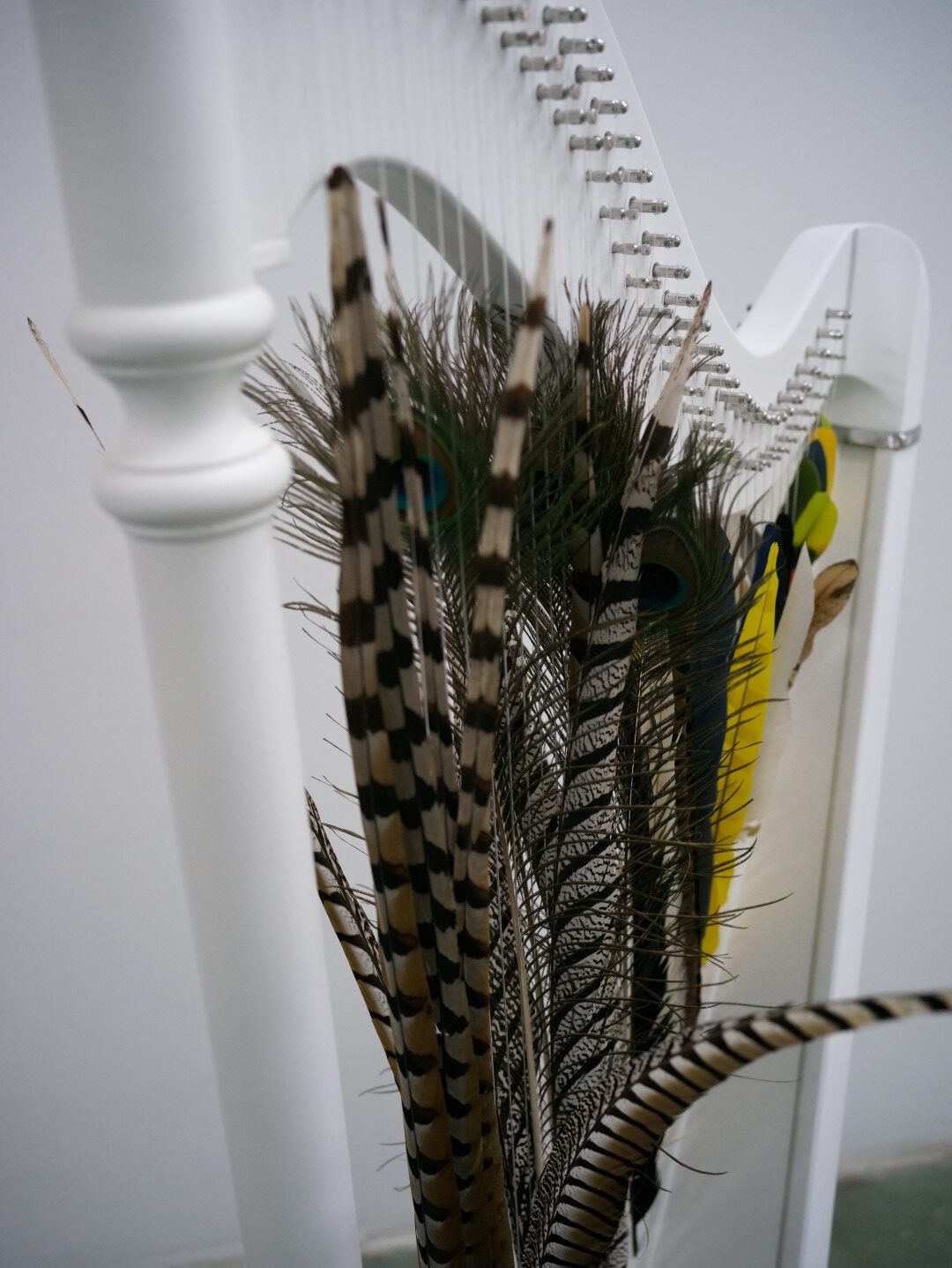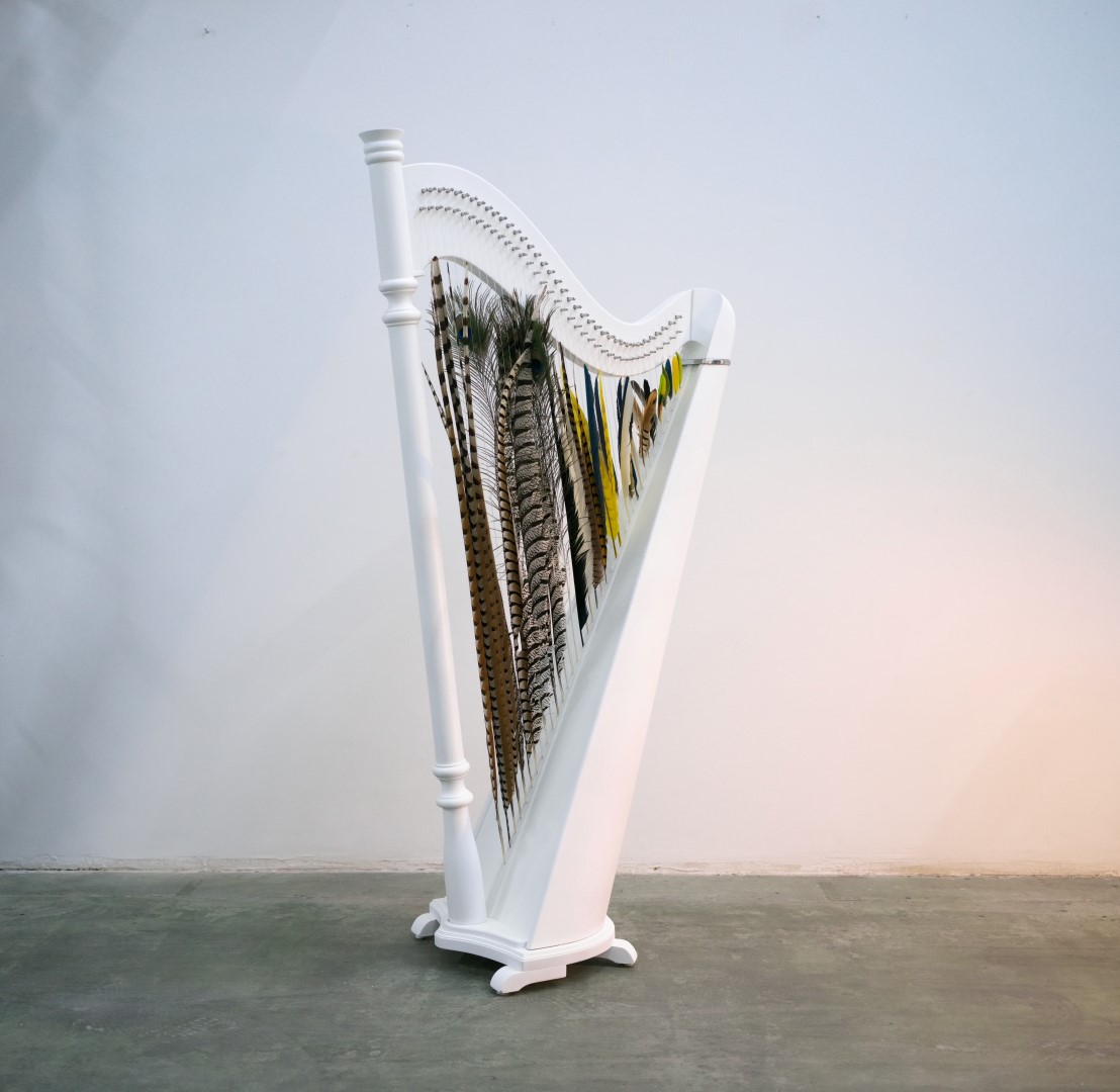 La delicadeza Delicacy 2025 Arpa y plumas de ave Harp and bird feathers 152 x 77 x 42 cm